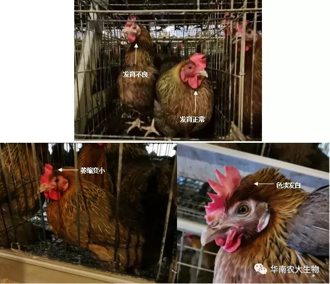 正常开产的成熟鸡群鸡冠、肉髯应该丰满挺立,红润温暖,感染IBV后出现异常的鸡群会观察到有部分鸡的鸡冠、肉髯萎缩变小、色淡发白,用手触摸感觉冰凉。