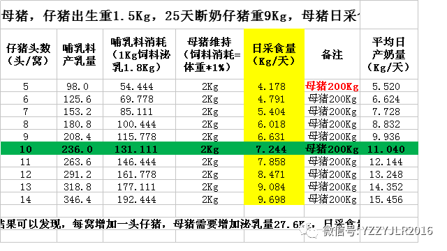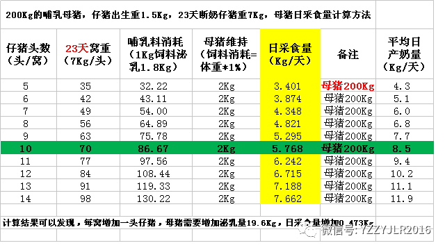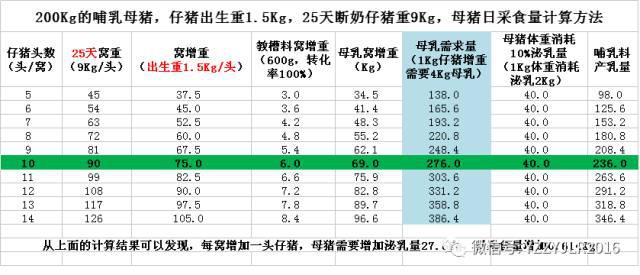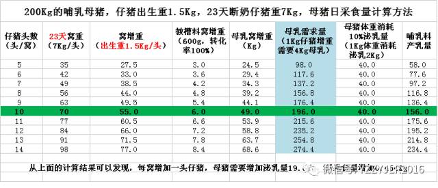 从上面的计算结果可以发现,23天哺乳如果仔猪断奶重在7g,每增加一头断奶仔猪,母猪需要增加泌乳量19.6Kg。日采食量需要增加0.473Kg。