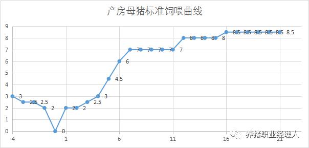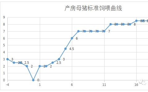 具体饲喂方法:产仔当日适当喂料,现代母猪产后1天可以喂到2Kg,第二天喂2.5公斤料,以后每天增加0.5~1公斤,产后第7天达到7Kg,之后自由采食。标准曲线见下图: