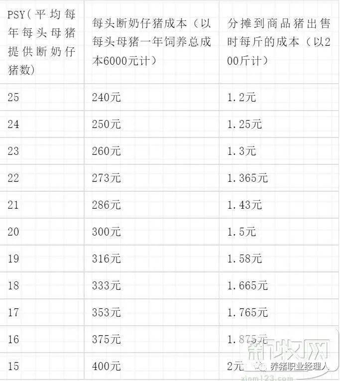 (2)都以较高水平PSY为25,料肉比2.4,断奶后死淘率5%计,则200斤出售时每斤毛猪成本为5.72元;