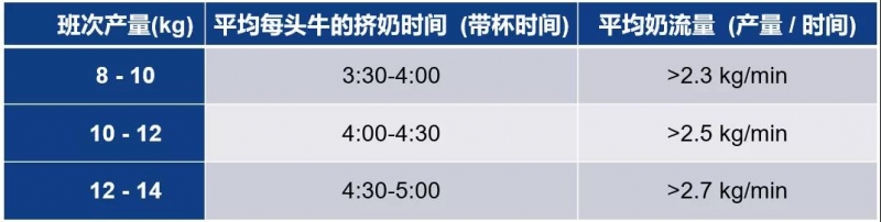 4 不同班次产量的挤奶时间、平均奶流量及低流量占比目标
