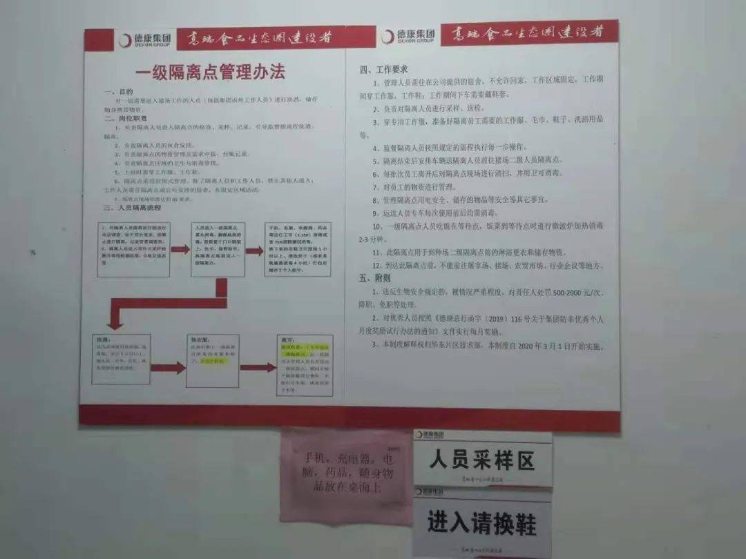 项目负责人表示:“作为新成立的公司,我们还处在胚胎期,要在萌芽状态就建好体系、定好标准。过去一年,泗洪德康人员从40来人骤增到600多人,规模快速扩大的同时如何养成良好素养、打造团队一致性;人员晋升后梯队建设、新人替补如何做到快速上手、尽早投入战斗?标识上墙是我们探索到的一个比较实用的方法。生物安全手册几百页资料,让谁来快速记住都不容易,有了标识之后却可以几乎做到直接上岗,只要执行到位,一切都能迎刃而解了。”
