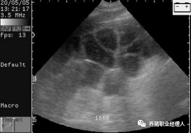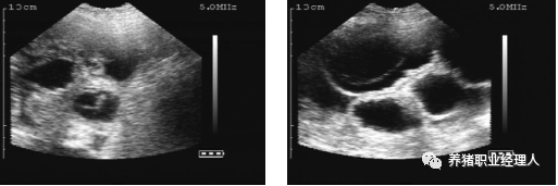 扫描配种第24天的母猪,大的胚胎囊可以很容易的看到。