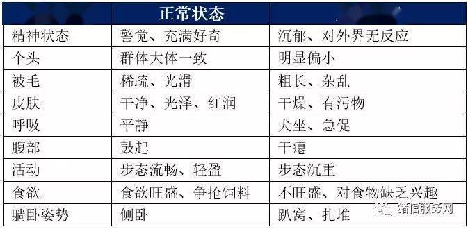三看:一看猪群群体精神状况和体况体征;二看皮肤与被毛,重点看眼眶周围、吻突、耳朵、四肢、腹下、肛门和尾巴;三看排粪姿势和粪便的颜色、形态、色泽,以及排尿姿势和尿的颜色、尿量。