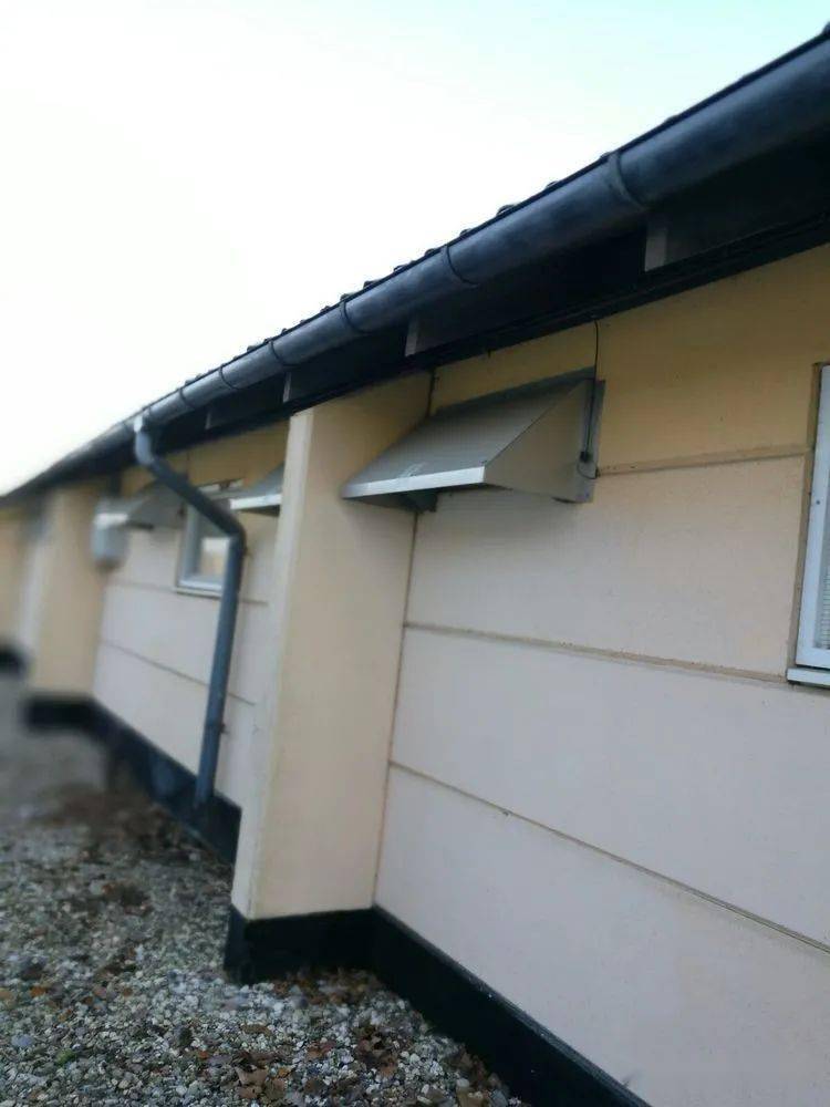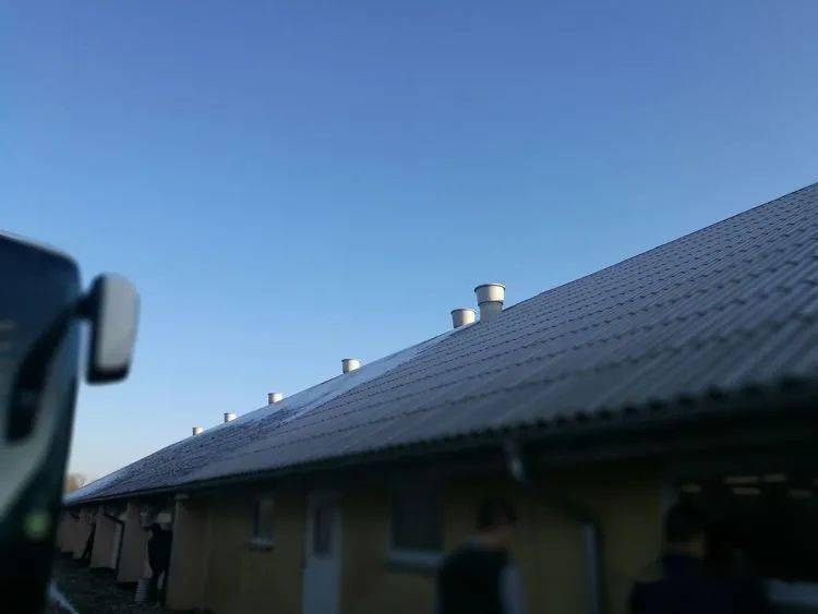 配种妊娠舍的补充进气口及屋顶排风机。