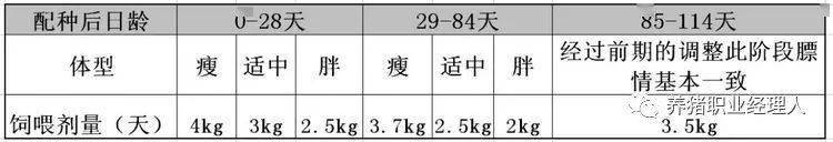 初产母猪配种后限饲,0-28d、29-84d、85-114d分别供给2.3kg、3kg、3.3kg