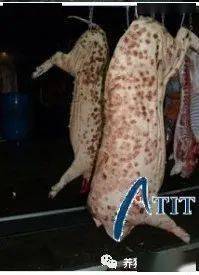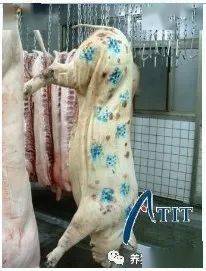 图7 屠宰场被废弃屠体的皮肤,散发暗褐色的菱形斑疹。