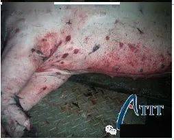 图5 屠体腹部皮肤有许多暗红色瀰漫性的出血点以及菱形红斑。本例为猪丹毒病猪,可见病变分布于肩、背、体两侧与腹部