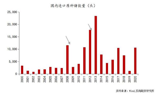 国内猪肉供需方面,从时间跨度长短来看,根据在第一期了解的生猪育种繁育体系,我们知道猪的育种需要从国外引入原种猪(也就是曾祖代猪),然后通过扩繁及杂交得到三元商品猪,因此国内猪长期供应要从源头的原种猪看起。按照常理来说,高猪价高利润一定会刺激人去引种,2008年、2012年这两次引种高峰也是伴随了高猪价。
