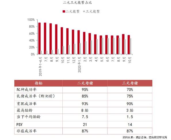 三元留种是非洲猪瘟打击下的无奈之举,这种模式虽然在一定程度上补齐了母猪群的缺失,但也有非常明显的缺陷。根据涌益咨询的数据,两种母猪的生产效率差距很大,那么我们后面进行推算也需要区分开来。简单来说,现在母猪虽然多,但将近一半都是三元母猪,效率低是事实。这种模式下生出的小猪,饲料转化率低,料肉比直接影响了饲养成本。另外,肉品种会一定程度的下降,未来仍然要逐步替换二元母猪。