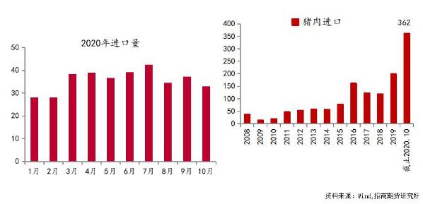 猪肉的供给除养殖端的情况是重点外,还需要看两个指标:进口肉和国储肉投放。到目前为止,进口肉屡创新高。海关数据显示,2020年1—10月累计进口猪肉362万吨,相对2019年来说几乎翻倍,可见高猪价的背景下进口依然有利可图,国内供需缺口仍然存在。
