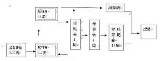 ①设定母猪8个月达性成熟可进入基础母猪群,后备母猪培育从出保育开始,则培育期=8个月-保育-哺乳;
