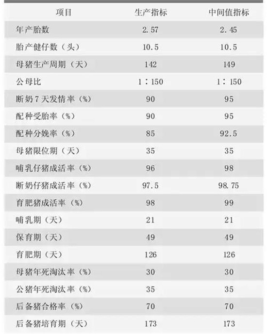 前者约为70%;后者=适配年龄-哺乳期-保育期,地方品的适配年龄约为6个月,引进品种约为8个月,按哺乳21天、保育49天计算,地方品的培育期约为16周(112天),引进品种约为25周(175天)。生产指标见下图。