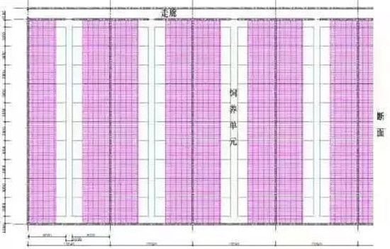 多数为双列式,每列两端不设通道,只两列之间一条通道,算法与分娩舍类似,面积为:长(每列保育栏数×保育栏宽)×宽(列数×保育栏长+1×通道宽)。