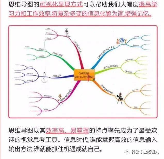 思维导图可以帮助我们记忆知识点,帮助我们更高效的学习,也帮助我们更有效的思考。读书、做笔记、开会、演讲时都可以尝试使用思维导图,还有我们在做大的项目策划、做管理方案、做决策、准备考试时,都用得到思维导图。思维导图应该是养猪管理者良好的工具,是训练养猪人思维的利器。