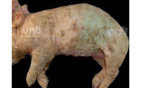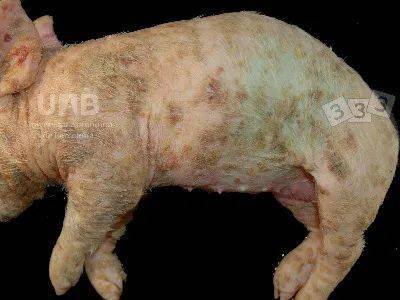 这是一头七日龄小猪, 皮肤损伤遍及全身,这种症状出现在这种日龄的仔猪身上是比较典型的渗出性皮炎(油腻病)症状。该病由猪葡萄球菌引起。