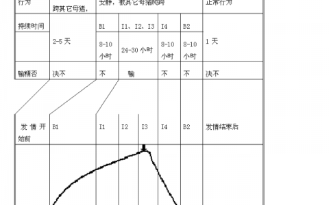 4) 黑线部分表示发情持续期。发情期又做了简单划分,分为B1期(对公猪反射1期,B即英文的Boar,公猪)、I1期(对人反射1期,I即Inseminitor,输精员)、I2期(对人反射2期)、I3期(对人反射3期)和I4期(对人反射4期)和B2期,每期约持续8-10小时。