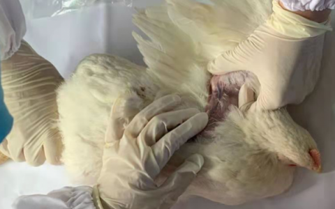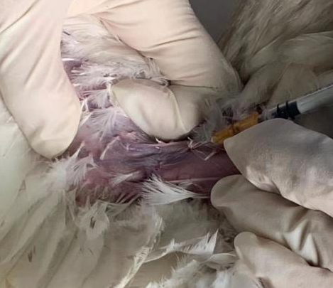 2、找到鸡的臂静脉(内侧翼静脉),静脉位于二头肌和三头肌之间的翅膀下,与肱骨、臂骨平行,区域类似三角形,几乎无羽毛覆盖,很容易找到。