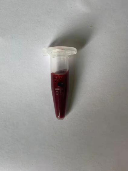 4、采集完毕后,尽快将针管里的血液注射入无菌塑料微型离心管中,盖上离心管盖,将离心管平放在避光常温处静止一段时间(一般需要20分钟以上),直至血清析出。
