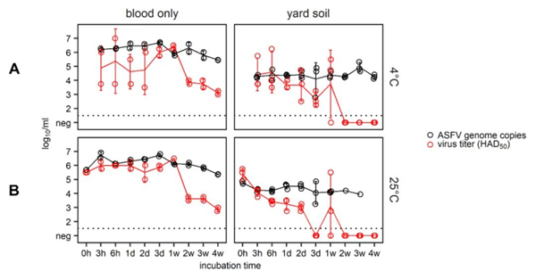 滴入感染血液的庭院泥土(pH6.7)中,无论哪种温度,非洲猪瘟病毒的感染性可以维持长达7天时间。在2周之后,直到观察期结束,庭院泥土检不出感染性病毒。