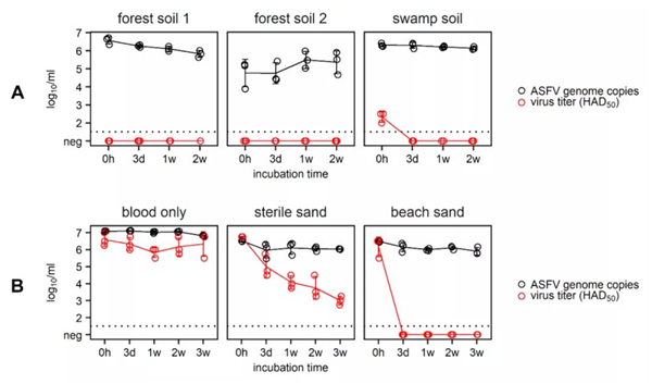 在另外的两个实验中,三种不同泥土类型(海沙、沼泽泥、森林土壤)中被滴入非洲猪瘟感染猪的血液,在室温(25℃)下存放3周时间。同时使用纯血和混合了纯血的无菌沙作为对照。