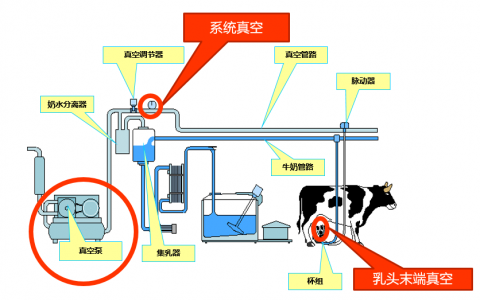 因此,真空泵是挤奶机正常运转的核心设备之一。但,真空泵一般安装在挤奶厅外,真空通过管路输送到挤奶厅,作用到挤奶杯组,最后作用到奶牛乳房。经过远距离的运输和传导,奶牛乳头末端所感受到的真空和系统真空是有差别的。