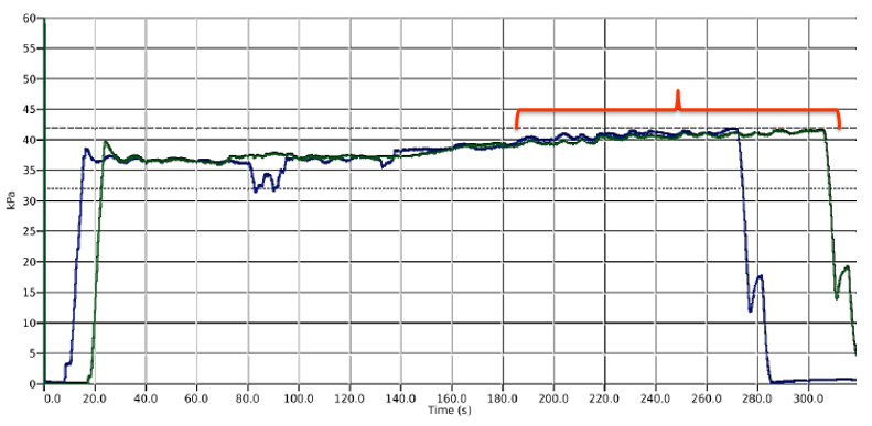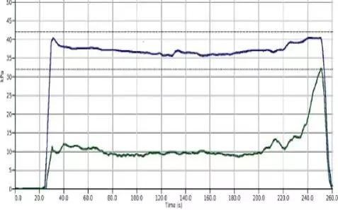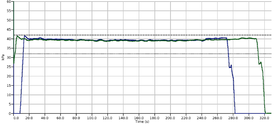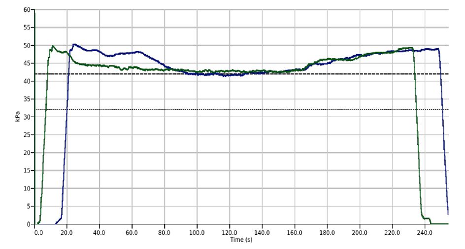 下图中,我们同时测量了两头奶牛挤奶过程中的乳头末端真空。可以观察到两头奶牛在上杯后,全程的乳头末端真空基本均在39-40kPa左右。