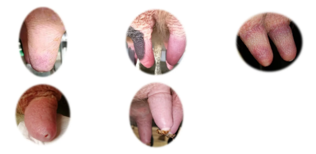 以上图片展示的就是在高真空下挤奶,奶牛乳头末端(或基部)可能出现的充血、变色、环状突起、严重角质化、乳头孔开放过大且乳头末端变硬无法及时完全闭合的不良状况。