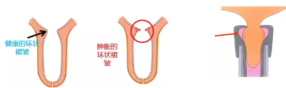 如果奶牛乳头外部出现环状突起,内部的环状褶皱也会出现肿胀,如中间图所示,会导致从乳池流入乳头的奶流受限,奶流速减慢,挤奶时间延长。