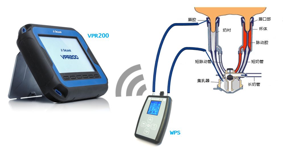 利拉伐服务人员会使用上述设备进行唇腔和集乳器/奶爪真空测试。使用专用针头插入奶衬头部或通过短奶管插入集乳器,针头经由软管连接到真空压力感应器(WPS)上。WPS将测量数据实时无线传输至接收设备VPR200并描绘成曲线显示在VPR200的触摸屏上,测试人员也可以结合实际观察随时添加备注标记。