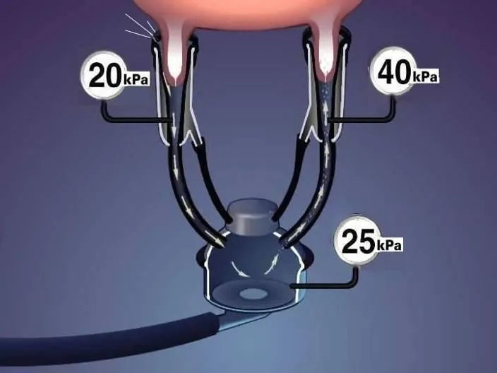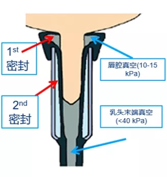 正常上杯后,乳头与奶衬之间有两个接触部位,第一个位于奶衬头部,第二个位于奶衬壁。密封良好的情况下,在这两个部位会形成两个封闭空间,分别为唇腔真空(通常为10-15kPa)和乳头末端真空(通常小于40kPa)。)