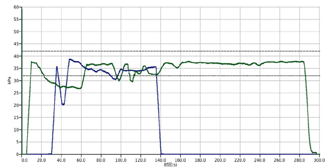 下图为两头奶牛挤奶时的乳头末端真空曲线,分别为蓝、绿两种颜色。其中,蓝线在80-100秒左右出现了漏气。180秒后,两头牛的乳头末端真空都升到了40kPa以上,持续时间也相对较长。