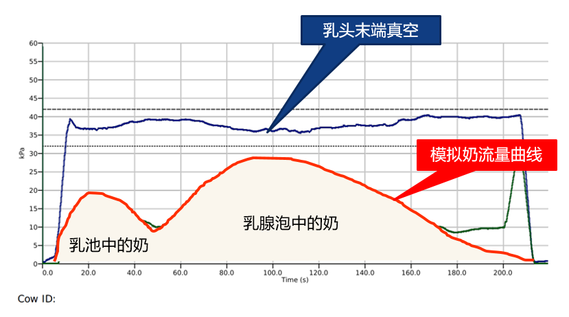 系统真空再高,也无法将乳腺泡中的牛奶吸出。乳腺泡中的牛奶只能通过奶牛分泌的催产素的作用才能排出。这就是为什么蓝色曲线的奶牛在高真空下依然出现了双峰。