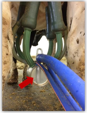 假设正常奶牛乳头末端真空为40kPa(如图中右侧乳头),左侧杯组出现漏气,该侧乳头末端真空降至20kPa,集乳器真空相应变为25kPa。由于右侧杯组真空压力大,会导致牛奶反流到右侧杯组。此时如果集乳器中有细菌,则会增加感染乳房炎的风险。