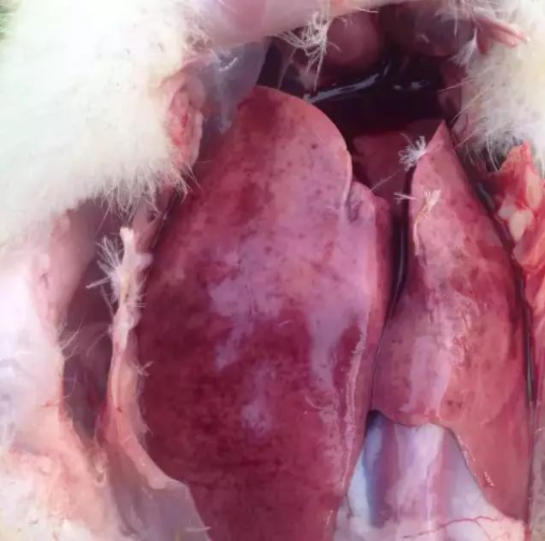鸭肝炎病毒潜伏期一般为1~4d,突然发病,病程短促。病初表现为精神萎靡,眼半闭呈昏睡状,羽毛松乱,翅下垂,行动呆滞,缩颈呆立,食欲不振甚至厌食、绝食;发病12~24h即出现神经症状,病鸭全身性抽搐、运动失调、两脚痉挛,身体倒向一侧或就地旋转,头向后仰呈角弓反张状,故俗称“背脖病”。少数病鸭死亡前排黄白色和绿色稀粪,数小时后死亡。也有的雏鸭无明显临床症状便突然死亡。 剖析可见肝脏特征性病变:肝脏肿大,质地柔软,呈淡红色或花斑状,表面有出血点和出血斑,胆囊扩张,充满胆汁。脾脏有时肿大,也呈斑驳状。肾脏充血、肿胀,呈暗紫色树枝状。