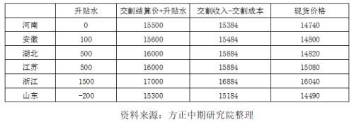 (3)交割升贴水。从交割库分布地区来看,河南为基准地,升贴水为0元/吨,湖北、江苏为500元/吨,安徽为100元/吨,浙江为1500元/吨,山东为-200元/吨。