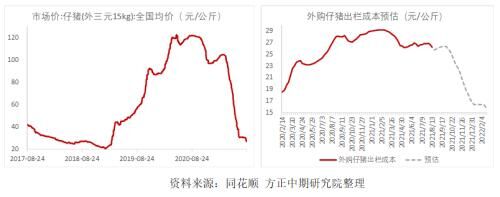 2019 年非瘟疫情爆发以后,能繁母猪产能的紧张导致仔猪供应紧缺,仔猪价格一度上涨至2000元/头的历史高点,外购仔猪育肥的成本一度接近30元/公斤。随着母猪存栏量的恢复以及生产效率的提高,今年一季度以来,仔猪开始进入产能释放期,仔猪价格的大幅下跌,带动6个月后外购仔猪育肥的出栏成本迅速下行。截止至上周,15公斤仔猪市场均价为27.34元/公斤,环比上周小幅下跌10.04%,较去年同期下跌 77.6%。按照这一仔猪价格计算,养殖场现在进行外购仔猪育肥并在6个月后出栏时的成本仅15.8元/公斤。