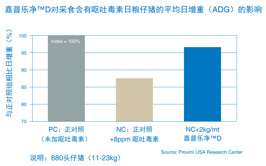 嘉普乐净TMD采用快速失活技术,以化学方法钝化毒素分子,毒性下降幅度最高可达 330倍,并在动物体内不解离。经过国外多个国家和地区、不同环境下已超过10年应用实践, 在多个动物体内试验,以及在体外试验和在饲料中使用,显示嘉普乐净TMD可持续显著地改善猪只的日增重和采食量,恢复猪只生产性能。同时,其在预混料、全价料中均可使用,不与其余原料发生反应,全面助力饲料厂稳定饲料安全品质,持续帮助农场增效降本。