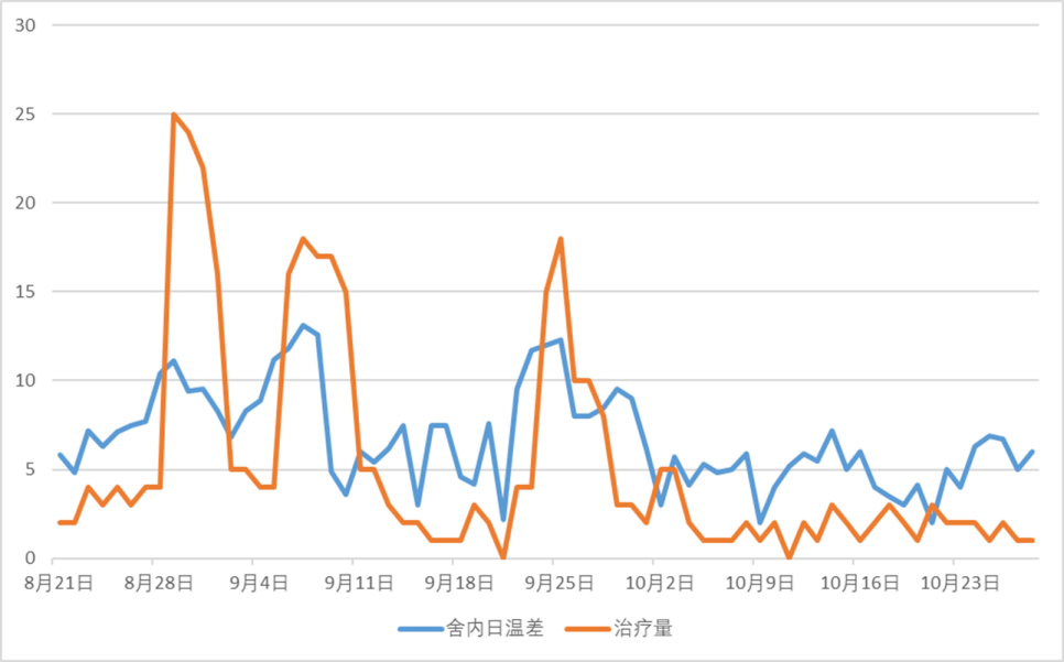 据中国农业科学院哈尔滨兽医研究所仇华吉研究员在第二届中国畜牧业生物安全大会的讲座内容,在试验猪场,用ASFV活毒模拟自然途径感染猪只15 d后,检测猪的血液、鼻拭子和肛门拭子,病毒抗原均为阴性,但环境病原检测为阳性,说明ASFV和猪共存的环境不等于会发生ASF疫情,也即“非瘟病毒+猪未必等于非瘟”。并且有研究表明,当猪群健康时,猪只接触低剂量非瘟病毒时有可能不被感染,故推测猪机体的非特异性免疫会发挥作用将之清除;反之,当猪群非特异性抵抗力较低时,其易感性更强。而在实际生产中,不良环境对猪群抗病力产生着极大影响。比如,在温差较大情况下,猪只会出现应激反应,表现为内分泌、消化、神经和免疫等系统的生理紊乱,抗病力下降,导致猪只更容易发病。2019年秋季,山西某猪场做了猪舍内温差及猪场治疗情况的记录,结果显示,每一个温差较大的时间段,都会对应一个治疗高峰(图3)。