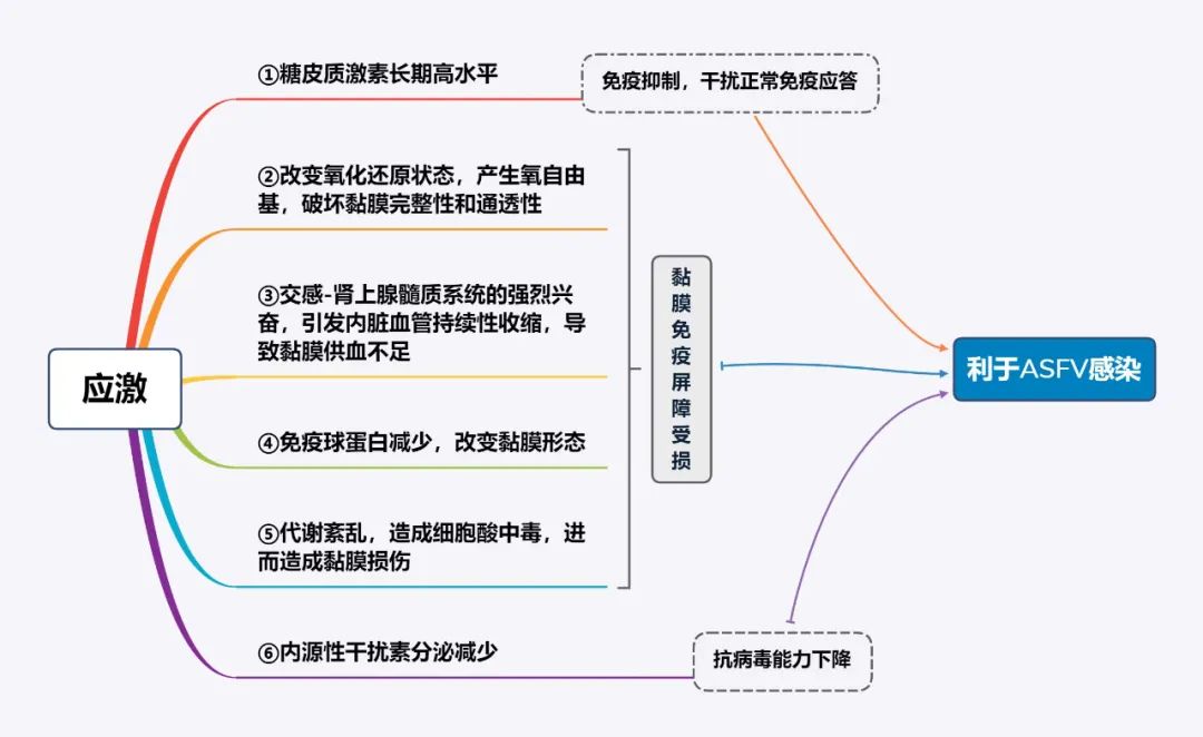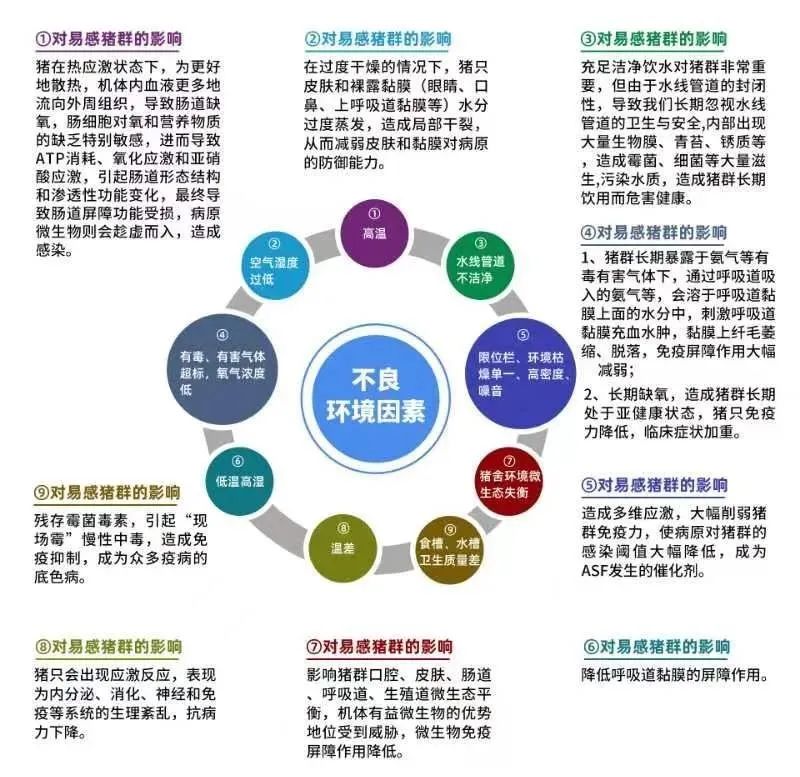 再比如,运动空间不足、空气质量差和潮湿等问题使得猪群长期处于多重应激状态,造成免疫抑制、黏膜损伤等一系列问题,使ASFV对猪群的感染阈值大幅降低(主要机制见图4)。诸如此类,众多不良环境因素皆会削弱猪群抗病能力,让猪群对ASFV的易感性大大提高,进而助推了ASF疫情的波动或发生(图5)。