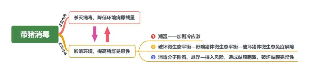 不得不提的是,着眼于病原的生物安全措施中,比较常用也被寄予厚望的一个手段即是带猪消毒,毫无疑问,其是控制ASFV环境载量的有效方式之一。但是,大部分化学消毒剂在带猪消毒杀灭病原、降低环境病原载量的同时,也在通过影响环境的方式直接或间接影响着猪群,造成黏膜损伤、抗病力下降,使猪群对病原的易感性提高,进而起到促进发病的作用,此为带猪消毒的“双向作用”(图6)。特别是2018年ASF疫情在中国发生以来,养猪场对于消毒的认识和依赖程度大幅提升。然而在很多猪场大量运用化学消毒剂的情况下,ASF疫情并没有因此被有效控制,其中重要原因之一即是在运用消毒剂时,忽略了化学消毒剂通过对机体黏膜和环境破坏而对疾病起到的助推作用。因此,在ASFV弱毒株普遍存在的情况下,带毒生产的可能性越来越大,探索更安全、高效、持久的消毒产品及模式也是系统防非中的重要一环,比如有机酸化剂(包括发酵酸)、银离子等新型材料实现环境自净功能等领域,值得进一步探索。