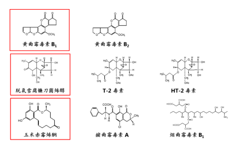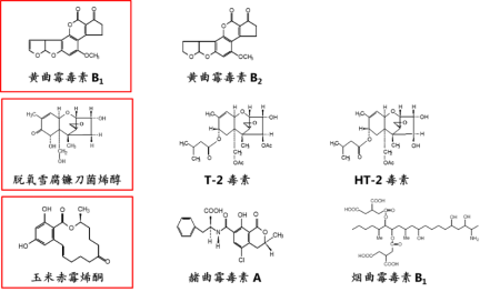 目前大约有100多种真菌产生300多种霉菌毒素;在动物饲料中常见且危害较大的霉菌毒素主要有黄曲霉毒素B1(Aflatoxin B1,AFB1)、玉米赤霉烯酮(Zearalenone,ZEA)、呕吐毒素(Deoxynivalenol,DON),而且三者共存的概率较高,具有叠加毒性,其危害也更大。
