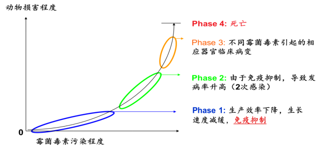 动物在采食含有不同剂量霉菌毒素的日粮时,将表现为生产性能和饲料利用率降低、免疫抑制、组织器官病变和损伤、繁殖障碍等,霉菌毒素还具有致癌、致突变和致畸性,严重时可导致动物死亡。另外,饲料霉变后其营养价值受损,甚至完全失去饲用价值。
