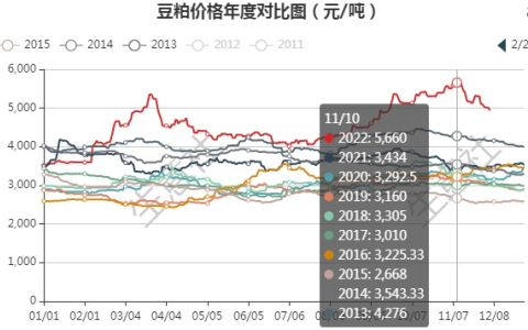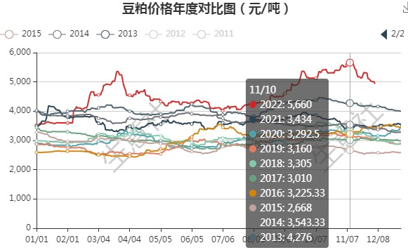 回顾2022年价格来看,11月10日,豆粕最高价达5660元/吨,创10年历史新高,价格比2015年的价格高出一倍之多,比起2013年的4300元/吨也高出1300元/吨。