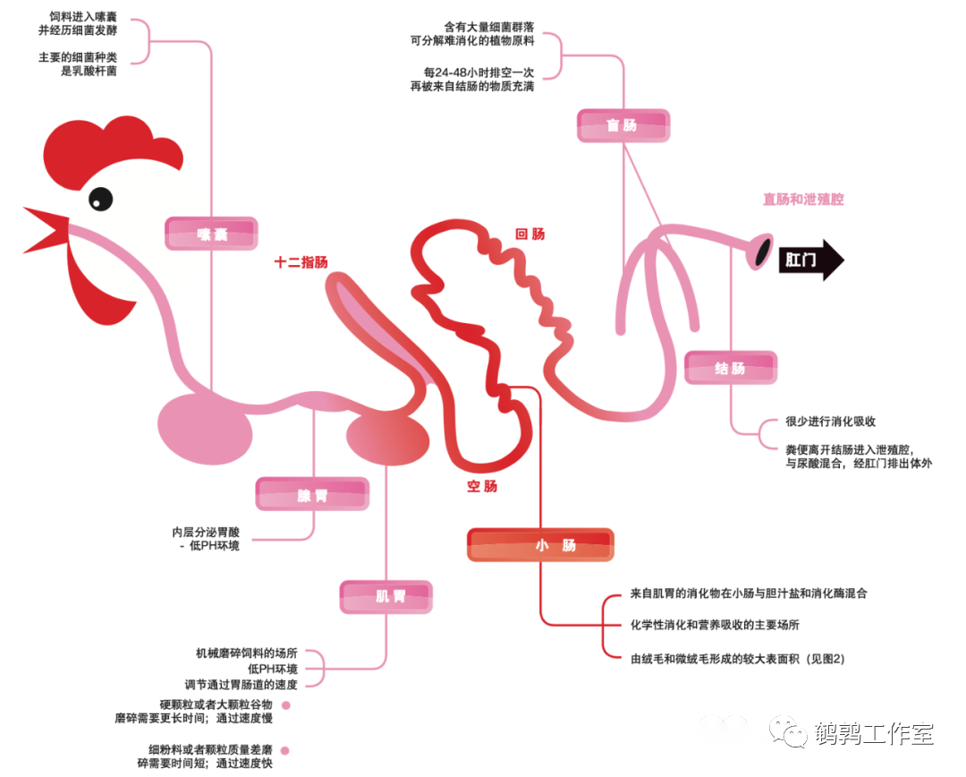 肠道分为5个不同区段 :嗉囊,腺胃,肌胃,小肠(十二指肠,空肠,回肠)和大肠(盲肠,结肠,直肠)。