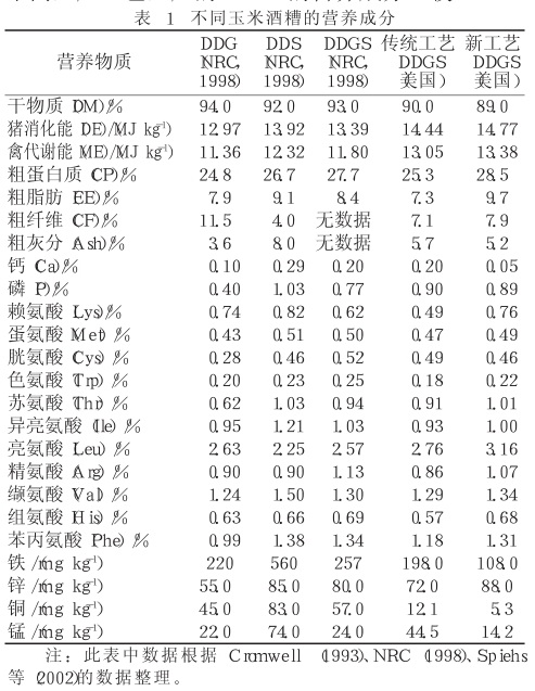 虽然不同种类、不同来源玉米、不同加工工艺的 DDGS营养价值不尽相同,但总体来说,与玉米相比,玉米 DDGS中的粗蛋白质(CP)、粗脂肪(EE)、粗纤维(CF)及矿物元素含量增加,淀粉含量降低。一些优质的 DDGS蛋白质含量接近豆粕,蛋白质中氨基酸的组成也比较合理,除赖氨酸含量相对较低外,其它氨基酸含量较高。DDGS中的必需氨基酸、非必需氨基酸和总氨基酸在生长猪的回肠末端表观消化率分别为72.3%、73%和72.7%,真消化率均为75.8%(张宏福等,1994)。此外 DDGS还富含菌体蛋白、水溶性维生素和脂溶性维生素以及发酵蒸馏过程中形成的未知生长因子,对动物肠道健康和免疫系统有益,而且 DDGS不含抗营养因子,适合作为畜禽、水产和特种动物日粮中的蛋白质和能量来源。美国伊利诺伊大学与美国农业部联合开发的“酶解干磨法”玉米酒精生产新工艺,不仅可增加乙醇产量,还显著提高 DDGS的营养价值。“新工艺”玉米 DDGS中有效磷占总磷的比例高达90%,为动物良好的磷源;“新工艺”DDGS的猪消化能与玉米相当(Spiehs,2002)。表1为玉米 DDG、DDS和不同生产工艺生产的 DDGS的营养成分比较。