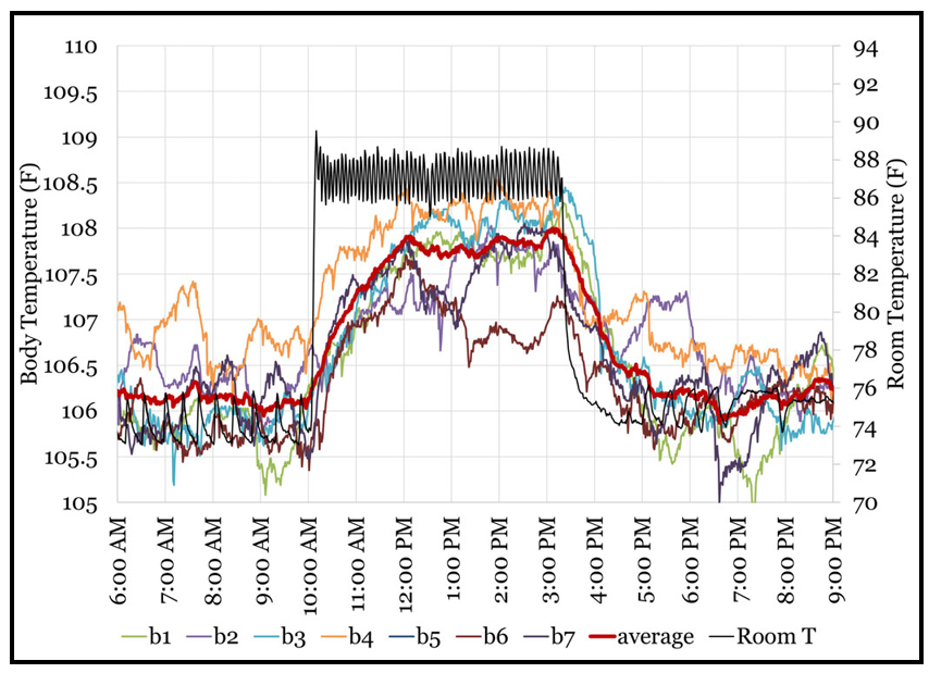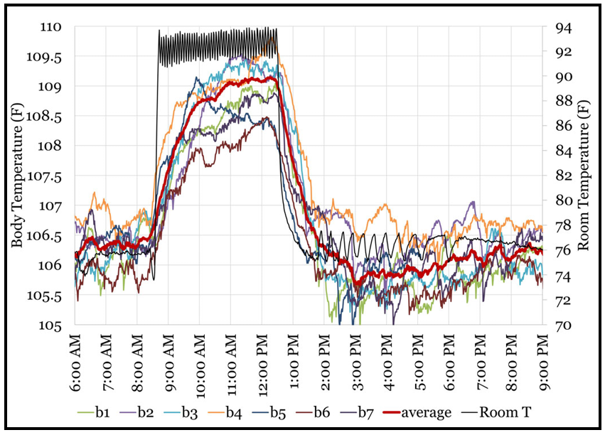 这次,当鸡舍温度达到87°F(约30.6℃)后,肉鸡的平均体温在前两小时内稳定在约108°F(约42.2℃)。