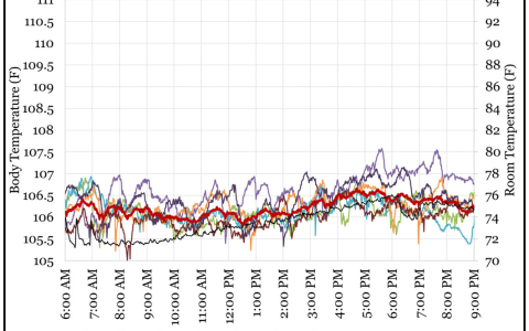 期间体温相对稳定,范围在106°F至106.5°F(约41.1℃-41.4℃)之间——属于先前研究报告的肉鸡正常范围。