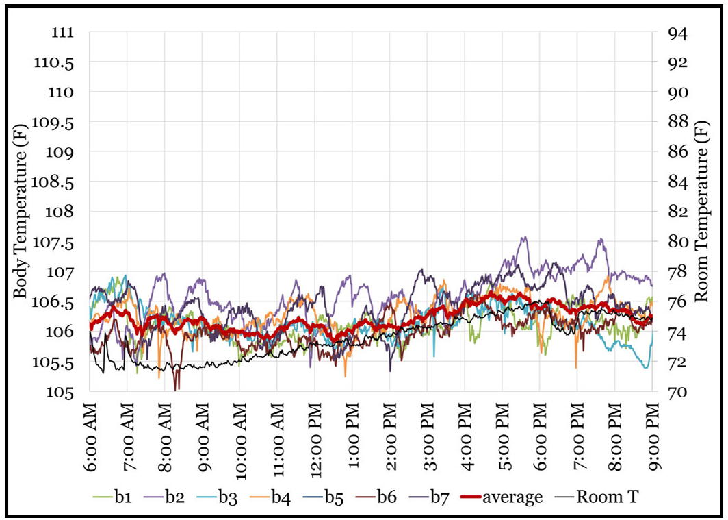 图1显示了研究第一天(上午6:00至晚上9:00)七只肉鸡的体温,在此期间空气温度保持在74°F-76°F(约23.3℃-24.4℃)。