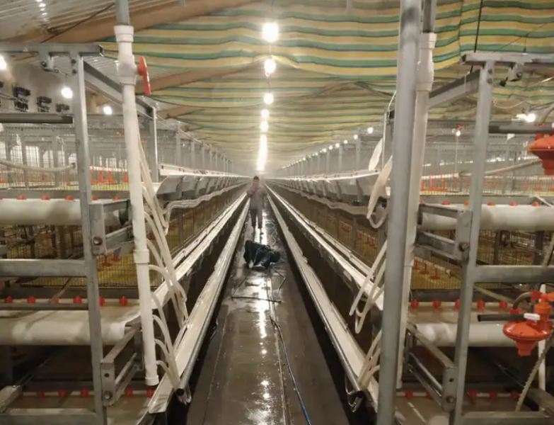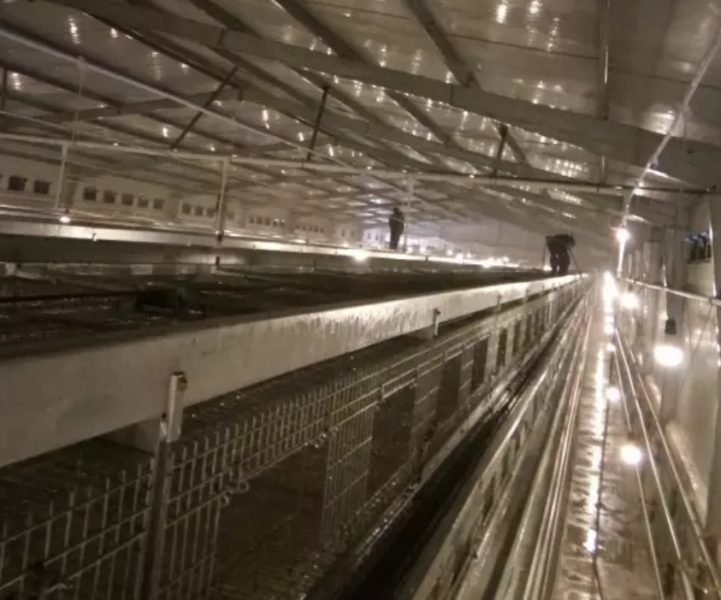 6、鸡笼冲洗:从第三/四层笼向下逐层进行冲洗。每层笼要由前向后进行冲洗,先将鸡笼内垫网及笼底网冲洗干净,然后将笼顶网、侧网、前网、后网、水线、水杯、料槽冲洗干净,冲洗完成后,在鸡舍后端,开启粪带,并对粪带进行冲洗,再将机头冲洗干净。
